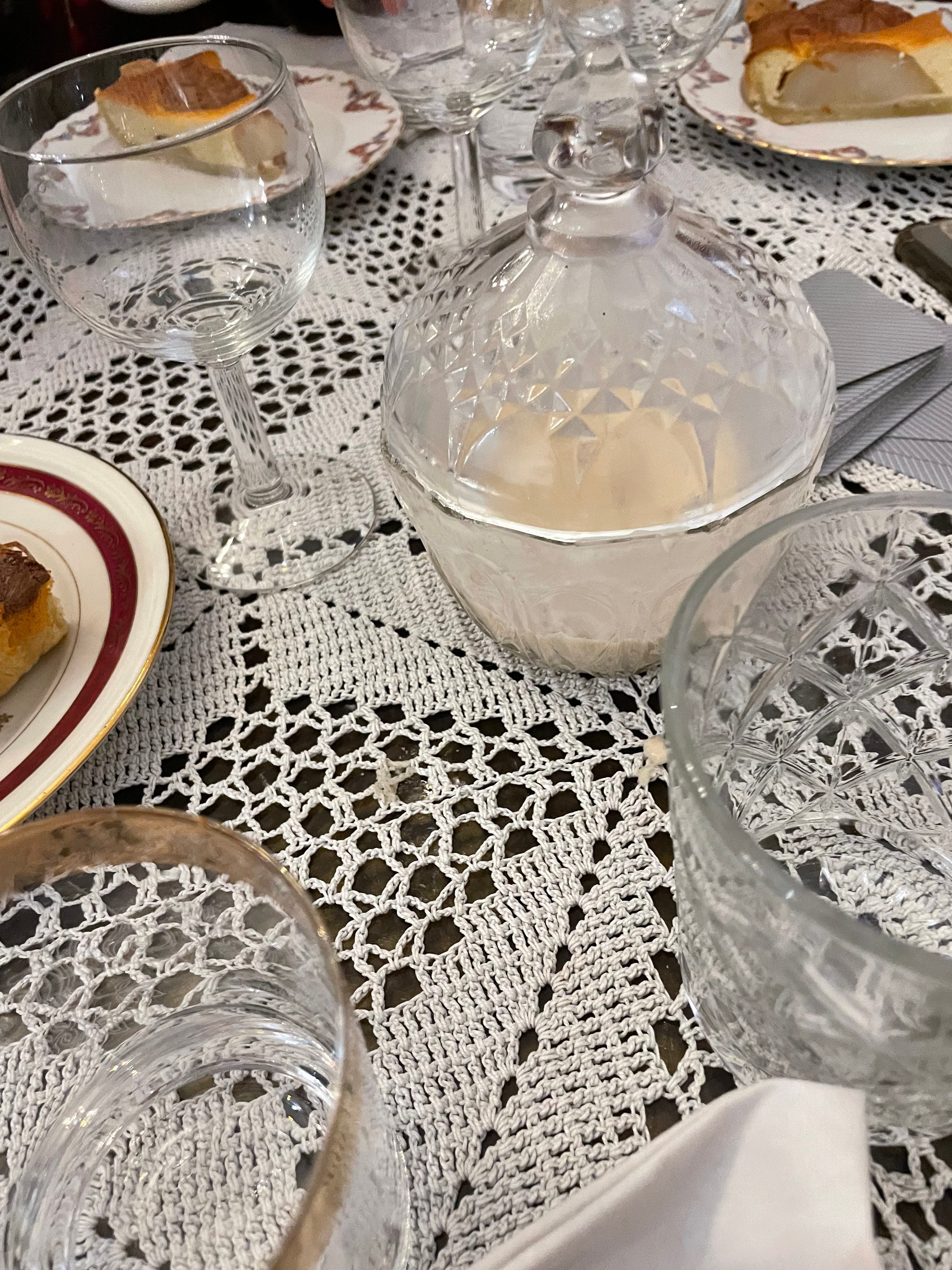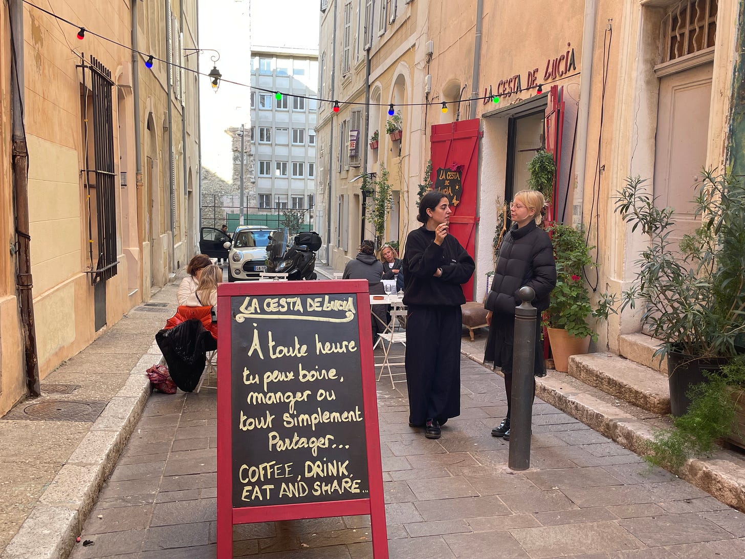 Poking our heads inside at La Cesta and telling Madame that we’d like to stay for lunch, she checked that we weren’t expecting our food to come quickly - vous n’etes pas pressé? We assured her we weren’t. She laid out a crochet tablecloth and some delicate, old fashioned glassware on the table in the corner. Swoon. It is 2pm. C is particularly in love with her at this point - her brown dress, her short haircut, her winking warmth. We plan to spend the next few years returning to Marseille regularly to nurse our relationship with the pair so that we become natural candidates to assume their roles when they retire. We try to play kabo less competitively than usual to protect the glassware. I have half an eye on my man behind the bar preparing our food. White wine comes in a small jug with a green handle. More ancient cheese puffs. We talk about cutting our hair short or whether we should keep it long whilst we’re young. There’s another table inside by now - a mother and daughter - and a few outside. A man has come in and Monsieur makes him a jambon beurre, which he eats leaning on the bar.