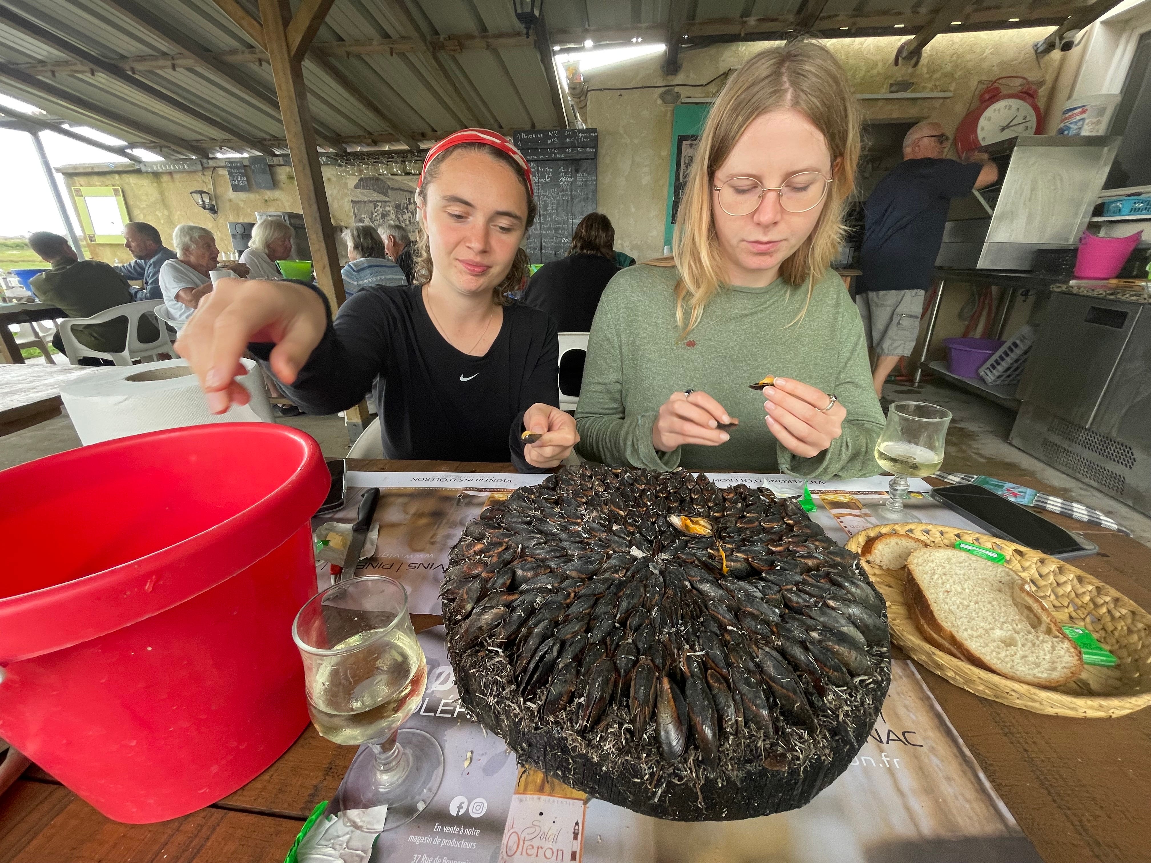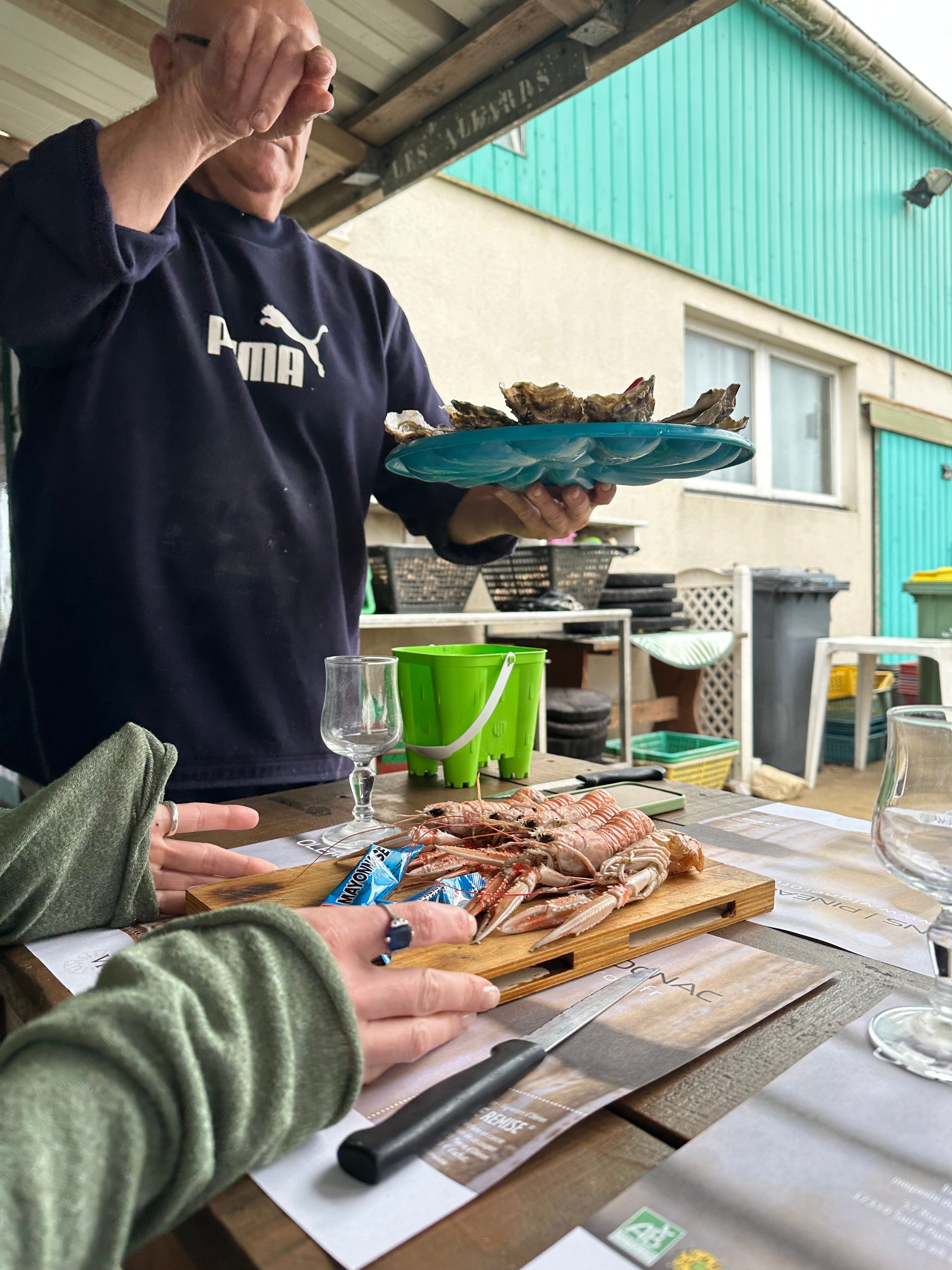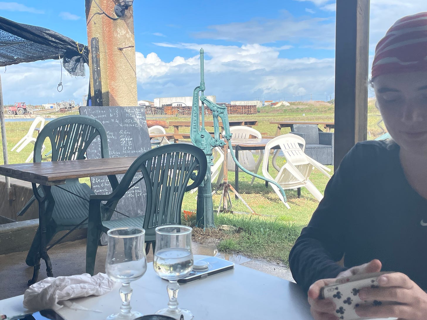 Thanks to C losing her phone, I wasn’t lovesick for long this time. We returned to La Cesta for coffee on Sunday morning as soon as it opened, crossing fingers that we’d find the phone in the bathroom. When we didn’t, we stayed anyway to drink espressi and sketch each other outside whilst C cancelled her bank cards. Monsieur put his chalkboard out. Next thing you know, we’re melting into lunch. A familiar feeling. A perfect lunch starts happening before you’ve even asked for it. We’d only stopped at Etablissement Ostreicole Joyeau Michel back in September because we’d had time to kill. But suddenly, you’re in exactly the right place. Pleased with yourself and in love with the world: trust your hosts completely and surrender. They know best and we are just here for the ride. We love them and they might just love us too.