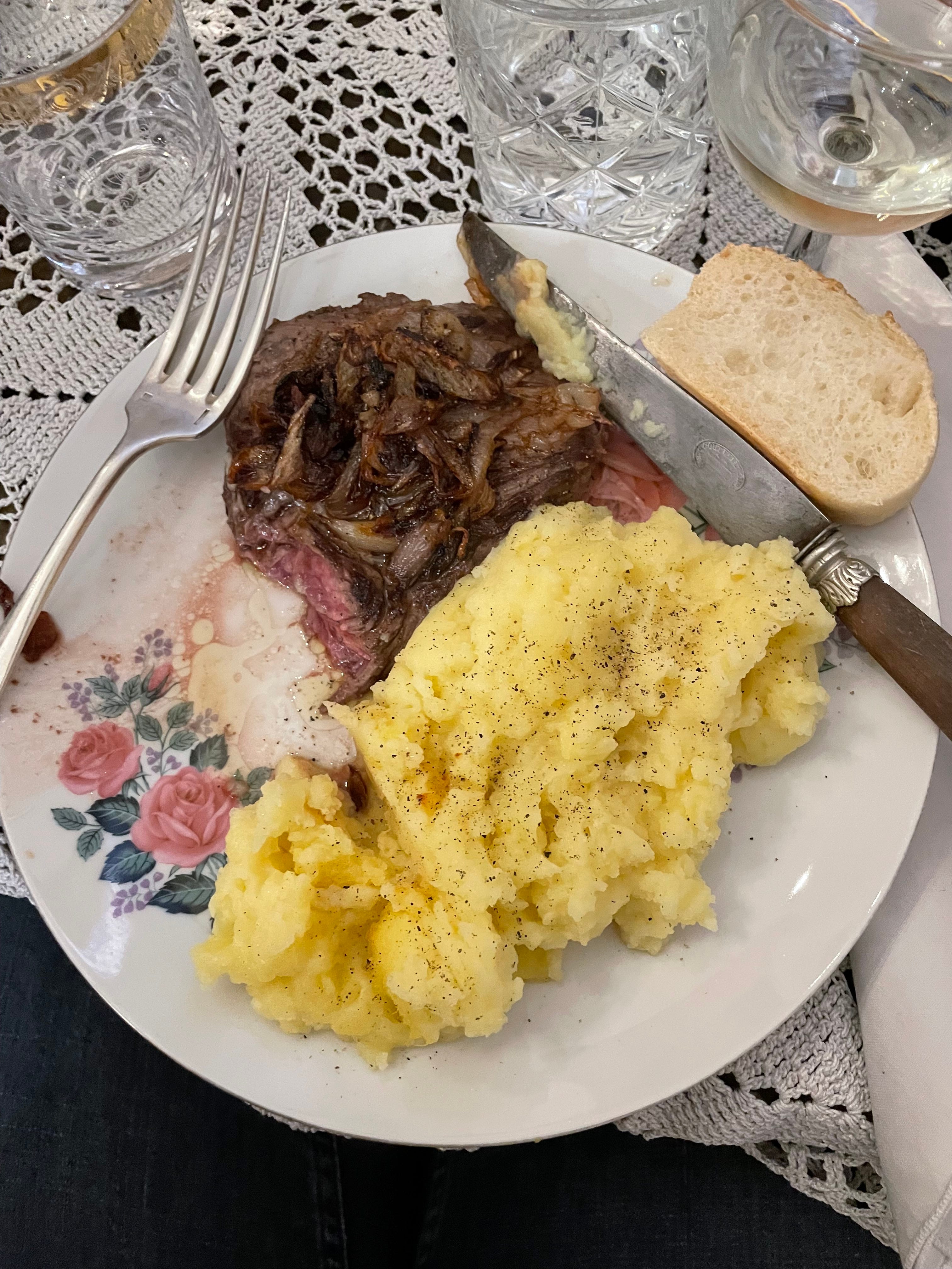 Our food arrives - two rare steaks for I and me (I’d be lying if I didn’t demand it bleu in part to impress my new mentor), one medium for P, each with expertly smooth mash and chewy charred onions from the pan. Two vegetable lasagnas for L and C. Emphasis on the vegetable, not the lasagna - it’s a vehicle for its ingredients, as promised. I am so happy. Once we’ve salt and pepper-ed our food, Madame takes the grinders to the next table. The steak is well-seasoned and bloody. I am nostalgic for a life of steak lunches that I never lived.